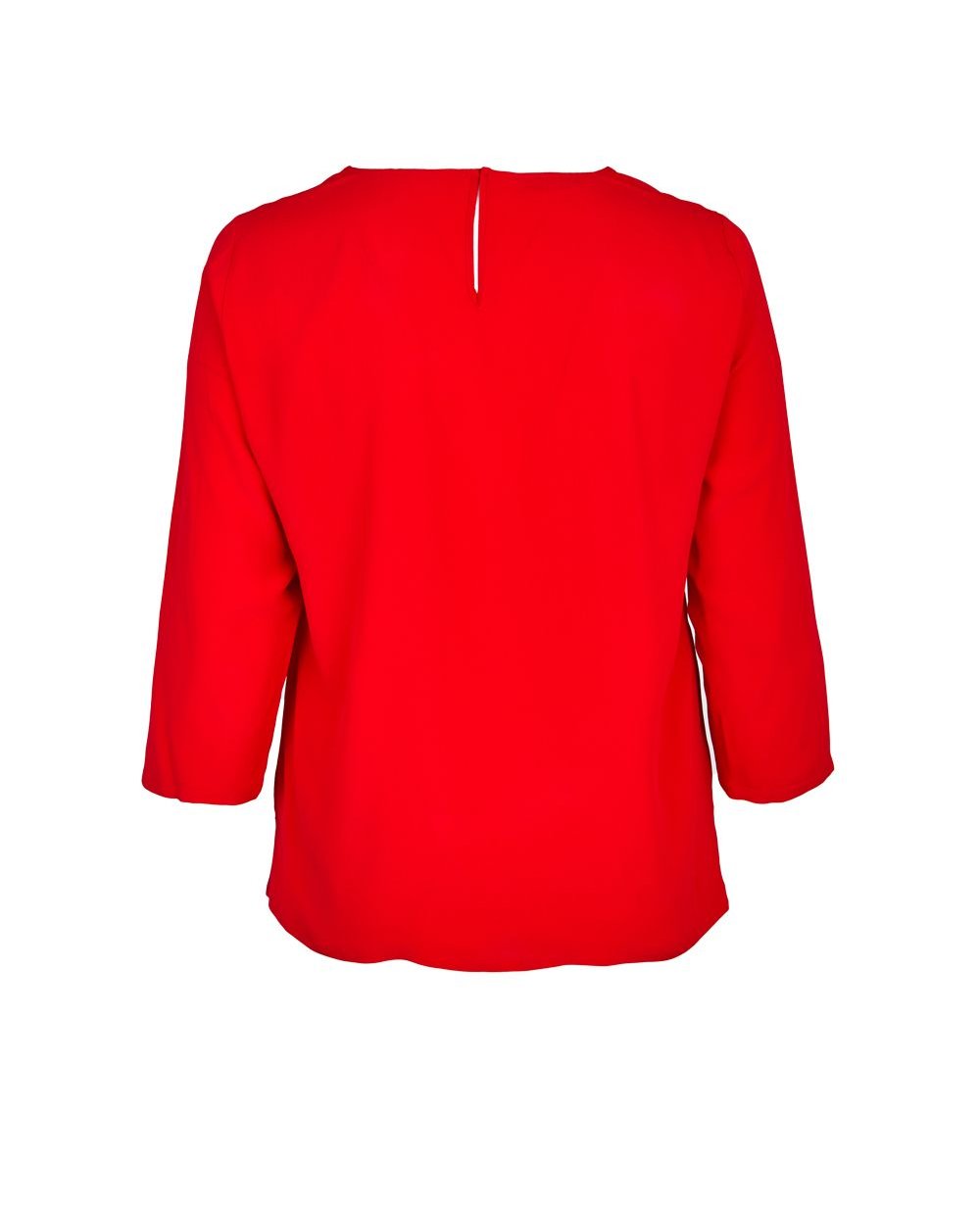 Блуза Elena Miro из шелковой, струящейся ткани насыщенного красного цвета. Круглый вырез горловины декорирован оборками переходящими в жабо по центру. Сзади застежка на одну пуговицу. Втачной рукав 3/4. Длина изделия в 43 размере - 71 см.