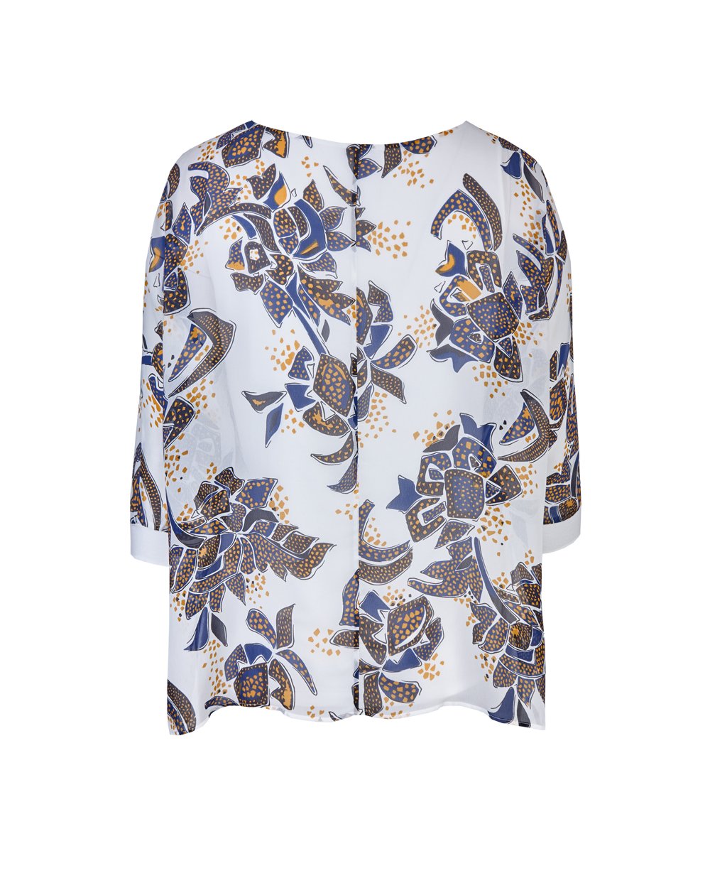 Легкая шифоновая блуза с печатным принтом - цветочная мозаика. Модель на трикотажной подкладке однотонного белого цвета. Вырез горловины лодочка, шифоновый укороченный рукав с манжетом из трикотажной ткани. По бокам блузы разрезы. Длина по спинке в 43 размере - 66 см.