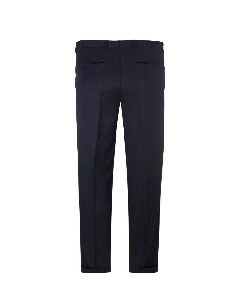 Штани чоловічі класичні з манжетами внизу, верхній зріз оброблений притачним поясом, зі складками на передніх половинках, на обох задніх і передніх половинках прорізні кишені в рамку.